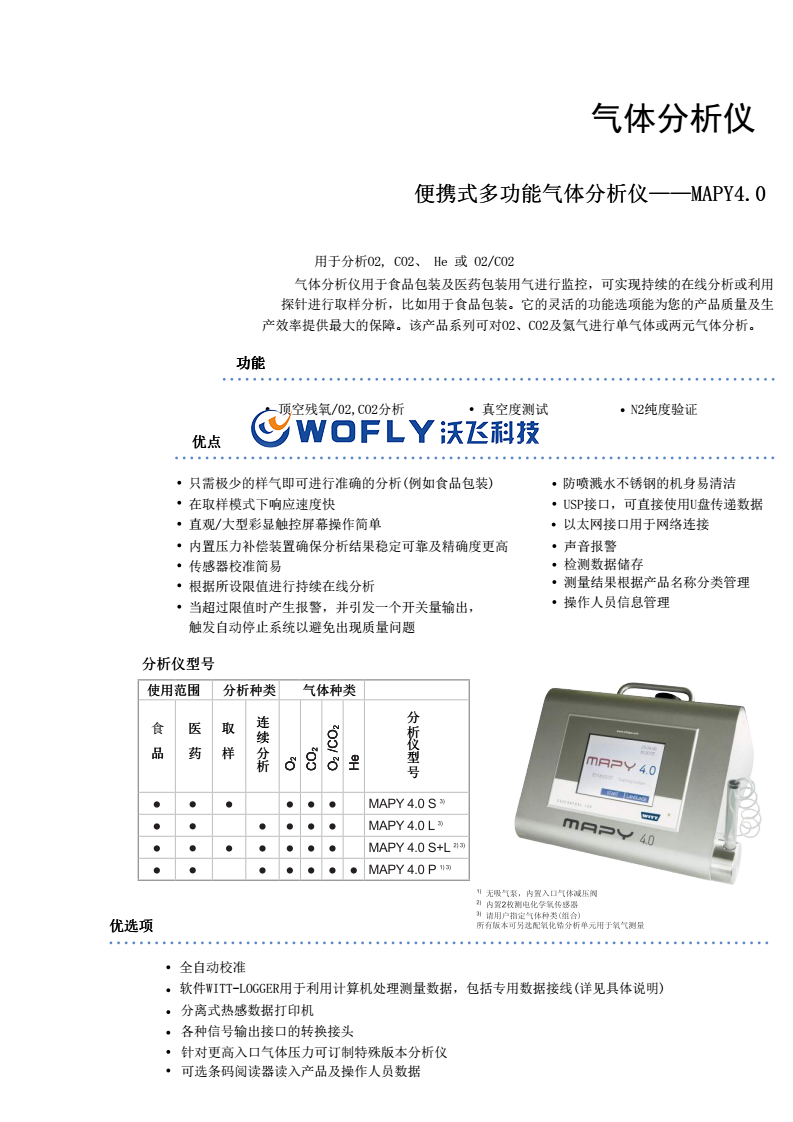 全自動校準(zhǔn)軟件WITT-LOGGER用于利用計算機處理測量數(shù)據(jù),包括專用數(shù)據(jù)接線(詳見具體說明)分離式熱感數(shù)據(jù)打印機各種信號輸出接口的轉(zhuǎn)換接頭針對更高入口氣體壓力可訂制特殊版本分析儀便攜式多功能氣體分析儀——MAPY4.0